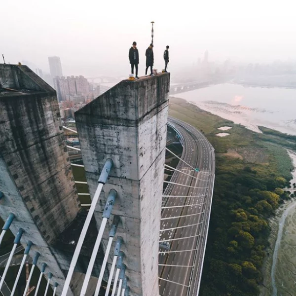 國外經常出現的國外極限高樓攀登運動玩家,以攀達摩天大樓等超高建築物聞名,冒著生命危險拍下照片上傳 IG 讓粉絲看了都讚嘆,不過這樣的危險舉動也曾經造成不可挽回的傷亡,沒想也出現在台北,只見三名男性爬上的居然是新北大橋的最頂端位置,利用